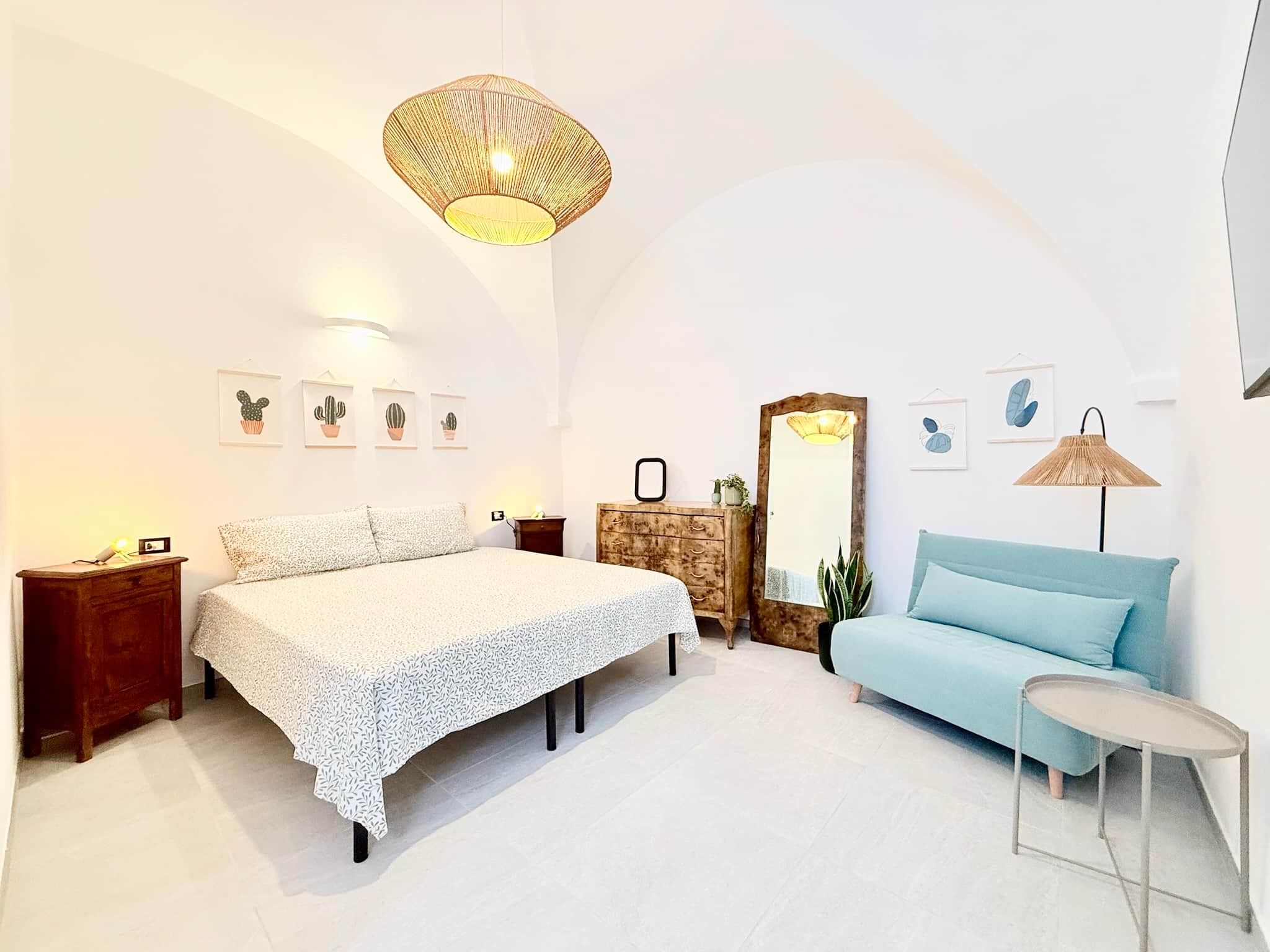 Una stanza dal carattere tranquillo e deciso: linee pulite, toni morbidi e dettagli che sanno di casa. Le volte danno respiro e personalità, i legni scaldano l’ambiente, e c’è sempre un angolo pronto per staccare davvero: due chiacchiere, un libro, o semplicemente “modalità pausa”. Il bagno segue lo stesso stile: moderno, essenziale, con tocchi scuri e un accento verde che sorprende e rilassa.